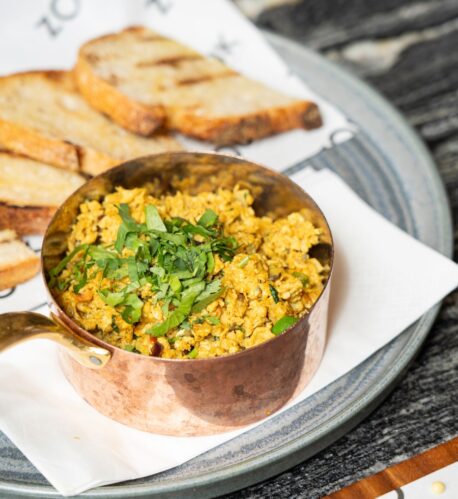 Authentic bites such as Channa Puri (crispy puris with spiced chickpeas and halwa) are also available alongside warm breads like paratha and toasted muffins. Sides feature grilled tomatoes, spicy beans, hash browns, mushrooms, and Mumbai masala potatoes in a zesty, spicy tomato sauce.