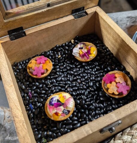 The theatre starts almost immediately, and before entering the dining room, you’re greeted with a glass of fizz and invited to peruse a small, dimly lit adjoining art gallery before joining your fellow diners for an appetiser…it’s all fantastic anticipation building.
