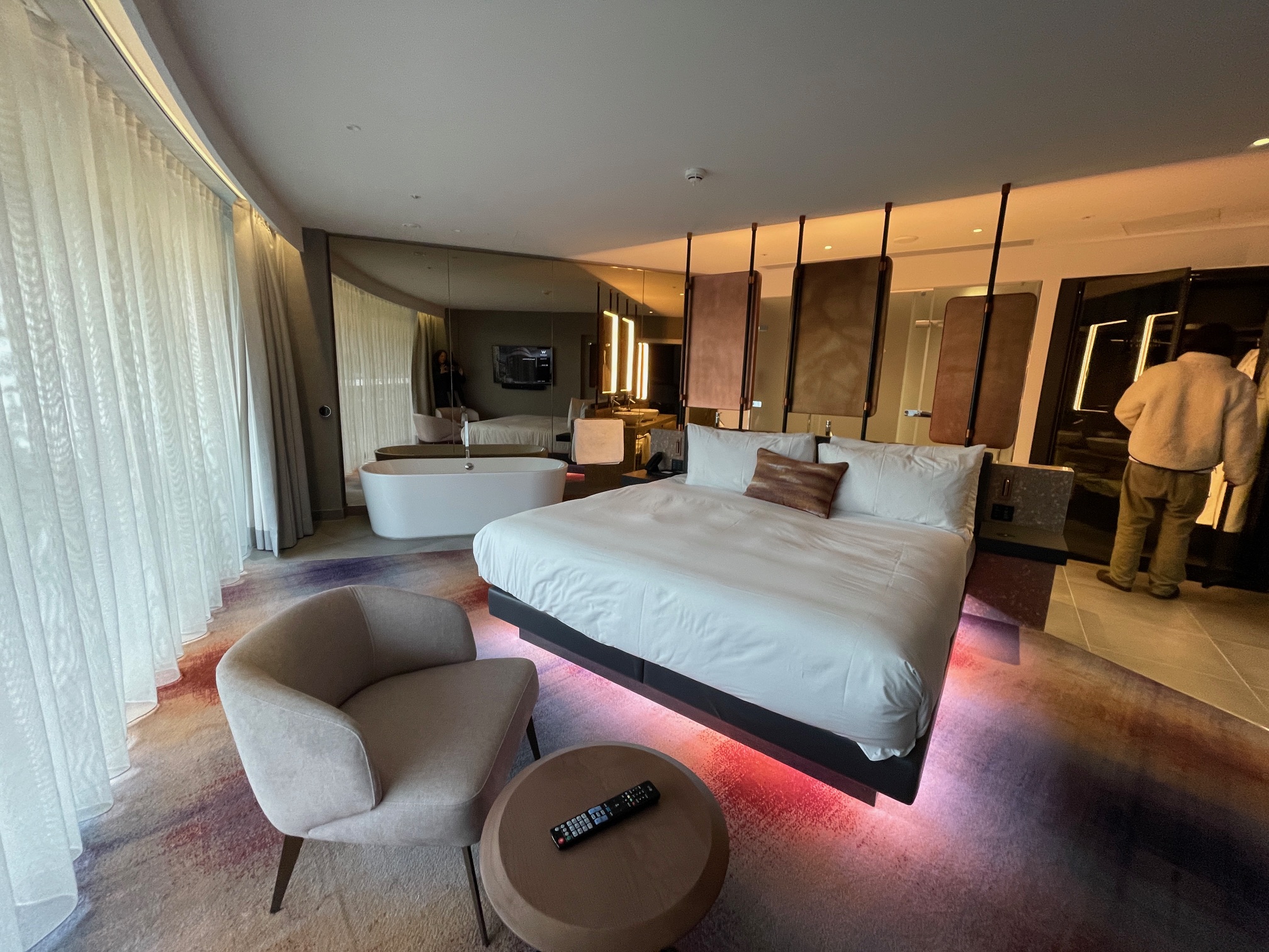 Lit in W’s iconic neon blues and pinks, a tartan-inspired installation overhangs the lobby and Champagne bar. Lifts whizz you through the heart of the building. Floors include a state-of-the-art sound suite for visiting musicians and spacious, spa suites themed around Air, Fire, Earth and Water. There’s a SushiSamba restaurant and bar complex and a genuinely breathtaking 360-degree viewing platform on the roof.