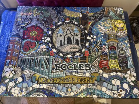 A mosaic created by artist Lauren Mullarkey with the Healthy Heart Group features pieces of various items donated by group members, including cups and saucers bought from Eccles Market, along with dress jewellery, badges and tiles they had at home. Referencing the town’s coat of arms, the finished mosaic has been photographed for inclusion on the hoardings and will also be exhibited at Eccles Gateway.