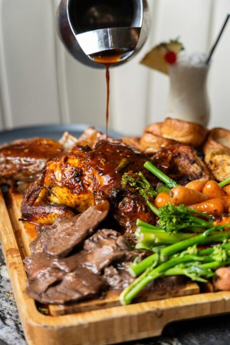 For the main event, Zouk’s famous Sunday Roast Sharing Platter offers a generous South Asian-infused spread designed for families and groups to enjoy together. Priced at £30 per person and available for parties of two, four or six diners, the platter comes with three roasted meats including Saji roasted lamb raan, a whole roasted chicken and succulent slices of beef topside, accompanied by golden roast potatoes, seasonal vegetables, Yorkshire puddings and a choice of traditional or spicy gravy. Guests who prefer a classic plated roast can also order individual servings from the kitchen.